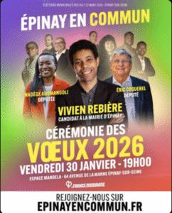 Voeux de la liste Épinay en commun, avec notre tête de liste Vivien Rebière, avec Nadège Abomangoli, députée et vice présidente de l’Assemblée nationale et Éric Coquerel, député de la circonscription et président de la commission des finances.